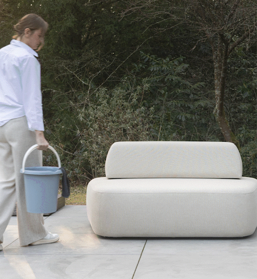 Onze outdoor banken kunnen het hele jaar buiten blijven staan. De stof is vet-, vuil- en schimmelbestendig en eenvoudig schoon te maken met water en zeep.